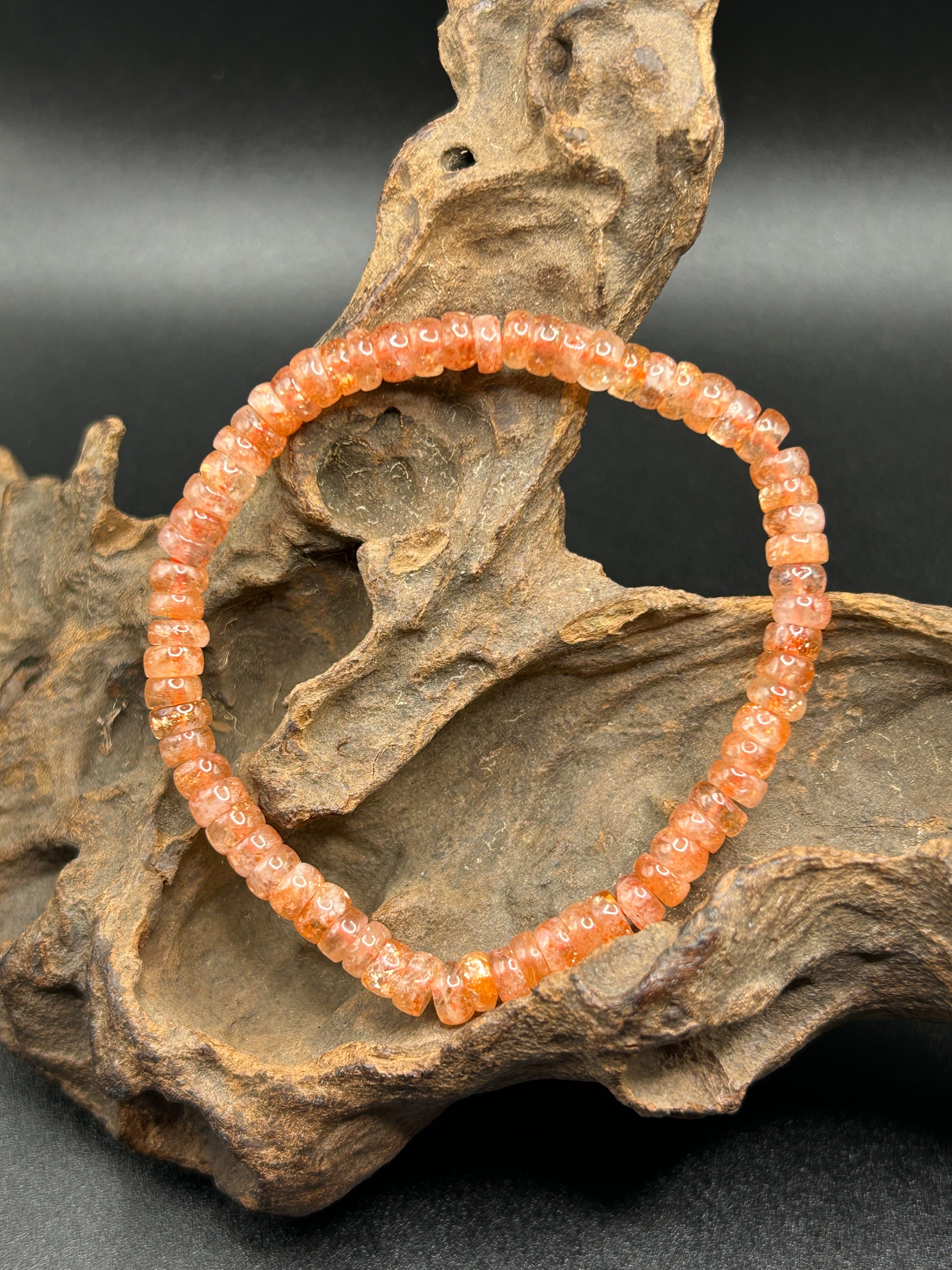 Armband in Donut Form. Der Sonnenstein soll das Selbstbewusstsein stärken und dabei helfen, negative Gedanken und Emotionen loszulassen. Umfang 15 cm. Perlengröße 5,4 mm.