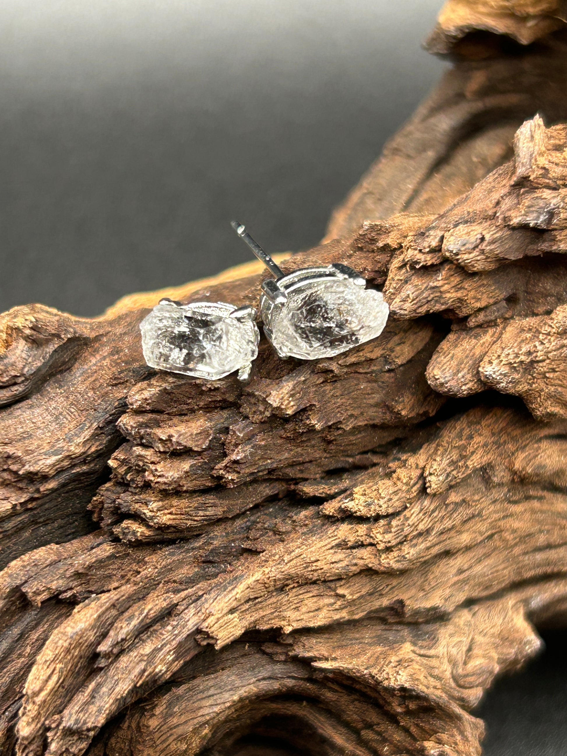 Schöne aus Rohstein gearbeitete Ohrringe. Der Stift ist aus 925 Silber der Rest Kupfer. Herkimer kann dabei helfen Vitalität geben und Verspannungen lösen.
