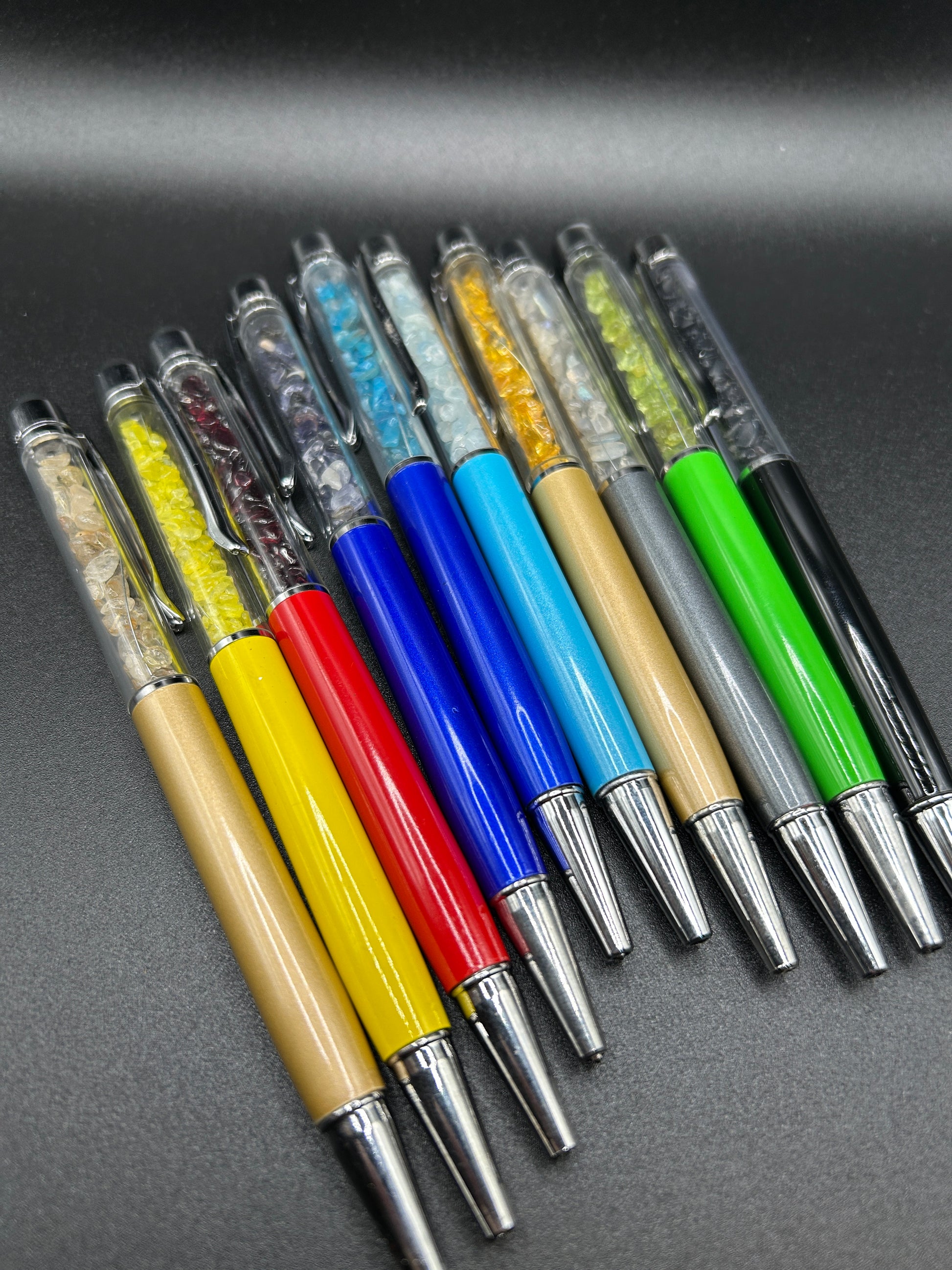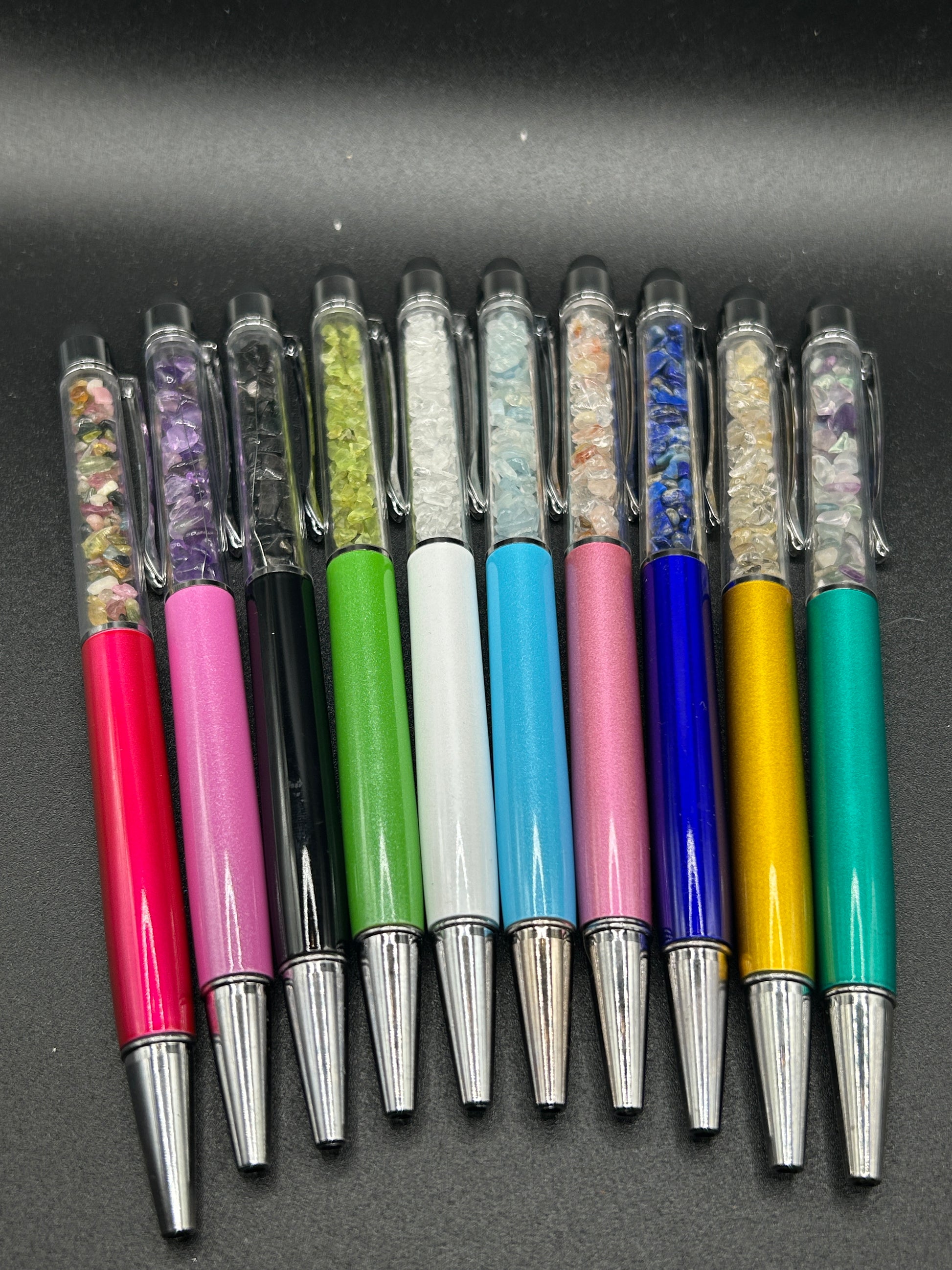 Kugelschreiber mit unterschiedlichen Steinen.