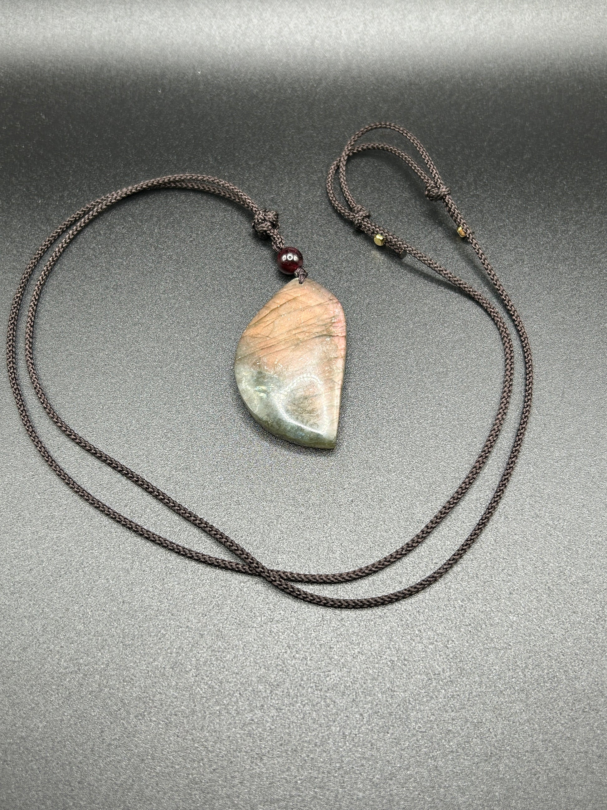 Dieser labradorit leuchten in gelb, orange und einem schönen pink. Die Kette ist durch zwei schiebeknoten verstellbar. Der Labradorit soll dabei helfen seine selbstheilungs Kräfte zu aktivieren.