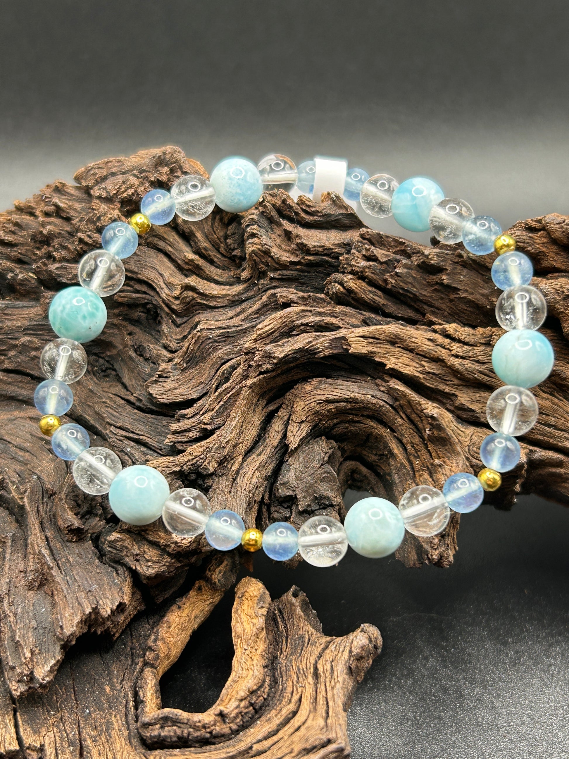 Ein wunderschönes Armband in der Kombination Larima, Aquamarin und Bergkristall! Abstandshalter sind kleine goldperlchen. Umfang 16cm